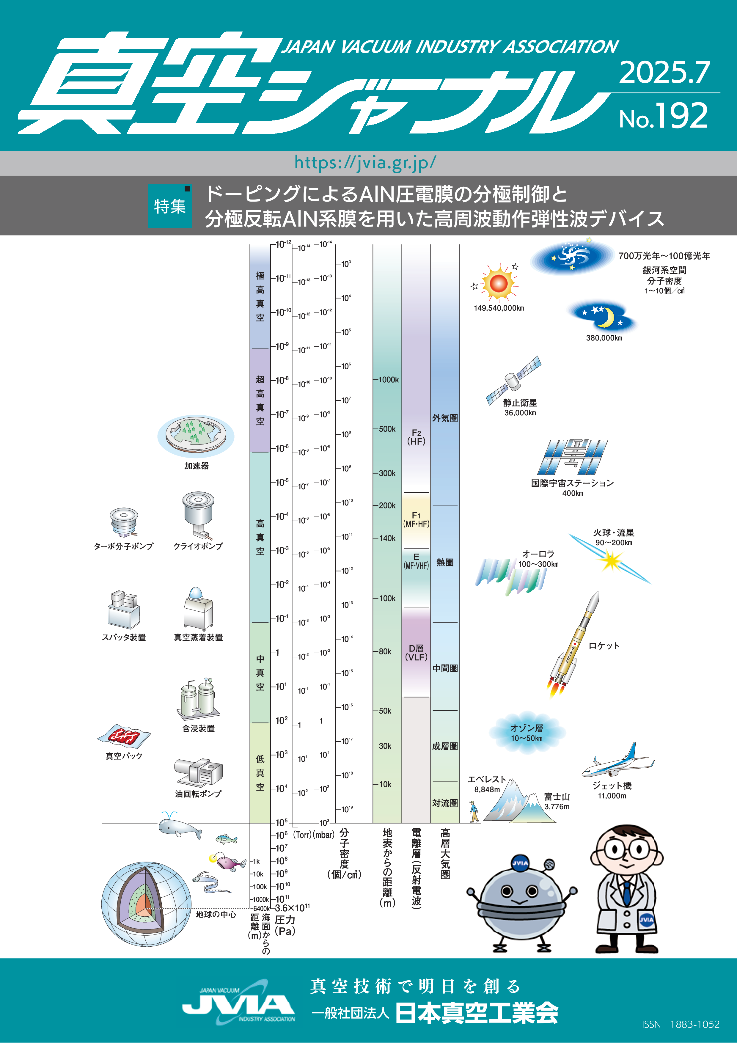 この情報誌は真空応用技術に関する技術動向、 市場動向、業界動向等のタイムリーな話題を提供する 「特集」、 次世代の産業を創出するキーテクノロジ(ナノテク、バイオ、IT技術など)と真空が融合する現場を取材した 「TECH・テク・TAKE」、未来技術を生み出す大学や国の研究現場を紹介する「研究室」紹介など真空に係わる興味深い 情報を満載しております。